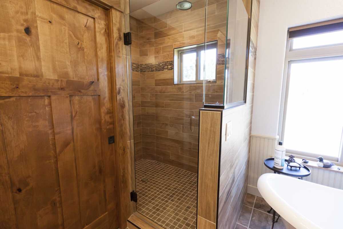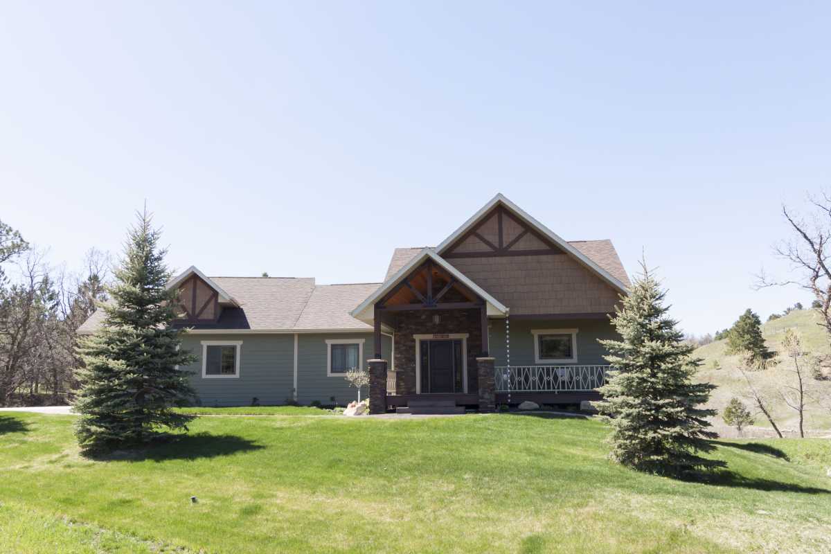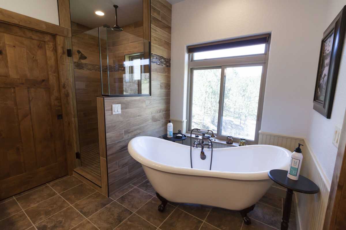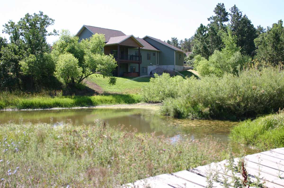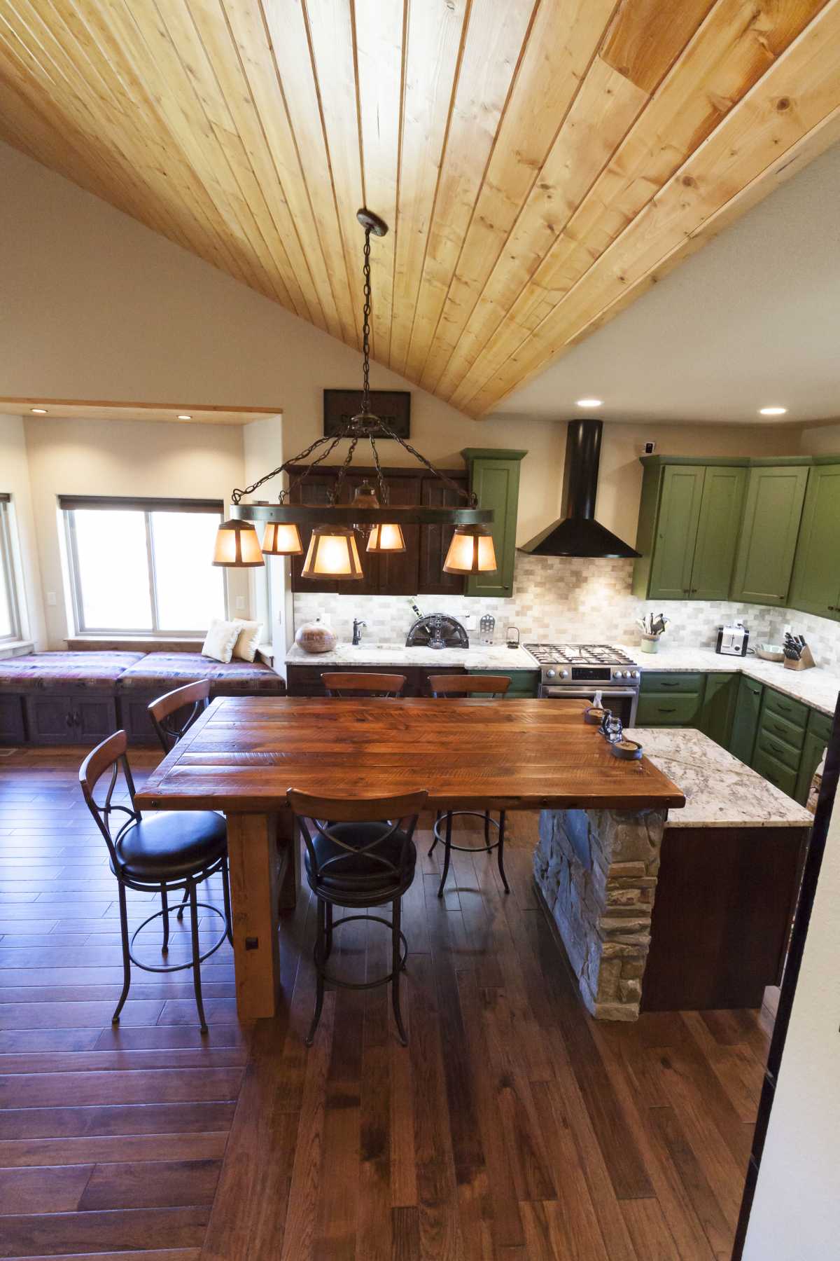 This vacation home is a beautiful blend of rustic and traditional and is set next to a tranquil country pond in the rolling Black Hills. The homeowner wisely paired various wood species and shades of stain to its exterior with warm green traditional colors that complimented and created a soothing, stylish craftsman cottage. The interior includes a welcoming open-concept kitchen and living area complete with green cabinetry and a stone fireplace. The master bedroom has its own luxurious bath complete with an old fashion claw foot tub and stunning tiled shower.