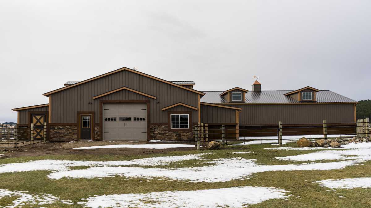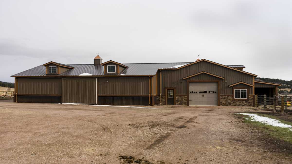 This horse stable is absolutely stunning with its rock exterior and metal siding. The copper accents give this project a warm, rich look and its rustic trim fit in perfectly with the beautiful lot.